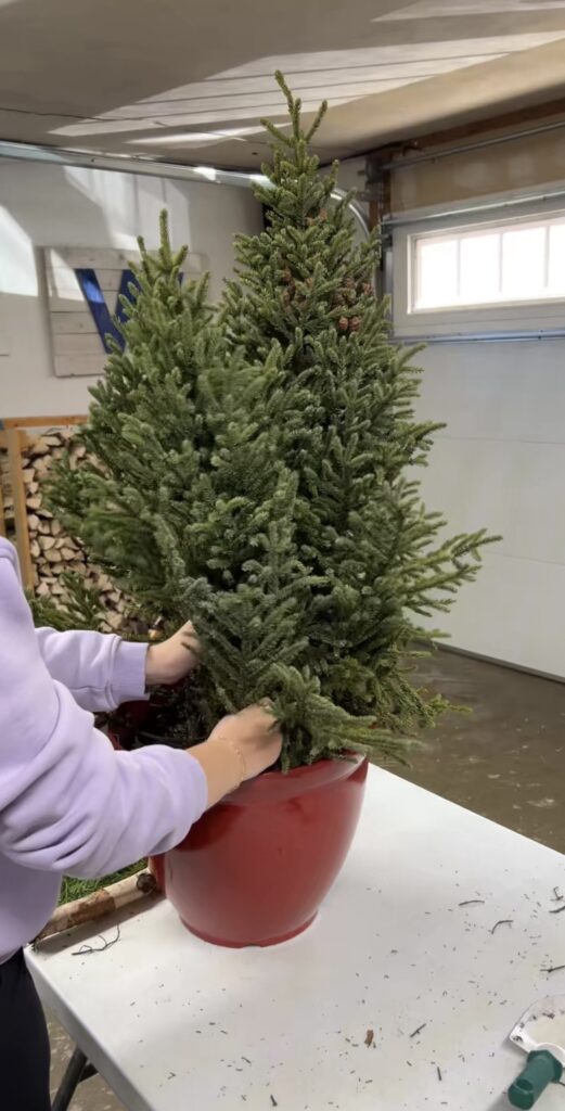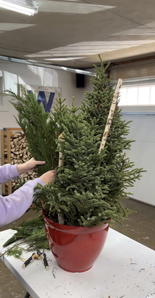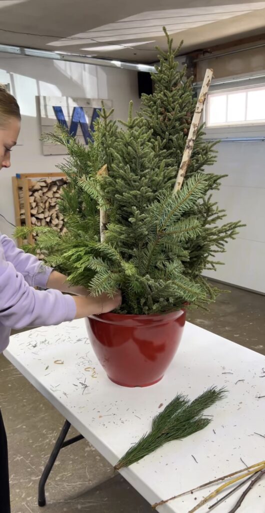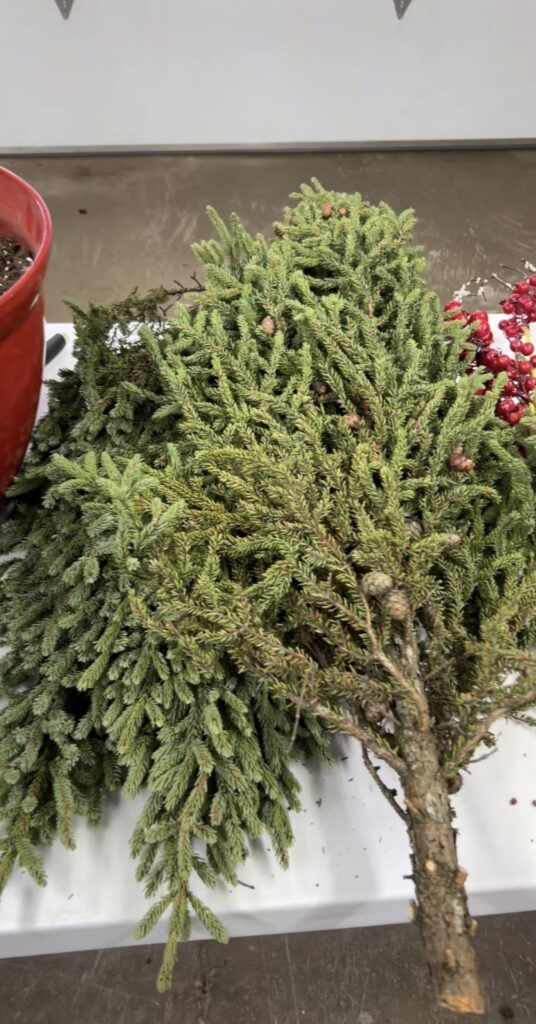 Next, you will choose the tallest spruce tip, and place toward the back of the pot. The spruce tip should be about 3 inches from the back of the pot. Then take two smaller spruce tips, and place them on each side of the pot. Place them about three inches from the right and left side of the pot.