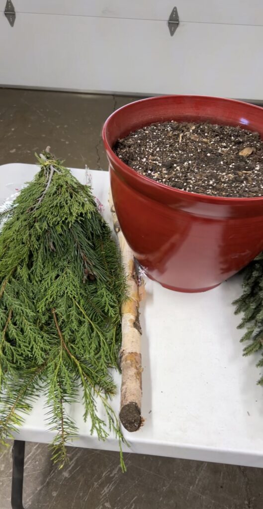 First, place dirt in the bottom of your pot. We use the same dirt year after year, since we always make a porch pot each Christmas season.