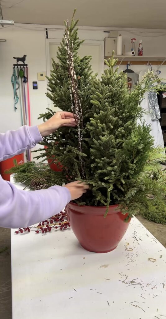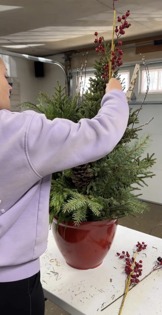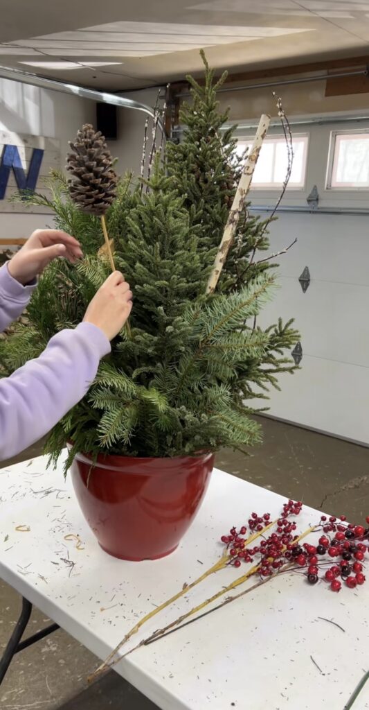 After that I added in all my decorations. I added three different sized pinecones around the pot. Then, placed two sparkly sticks in the back of my pot. I want these to stick out of the back of each side. Next, I then also added some cranberry sticks scattered around the pot. I stuck one in the front and two towards the back.