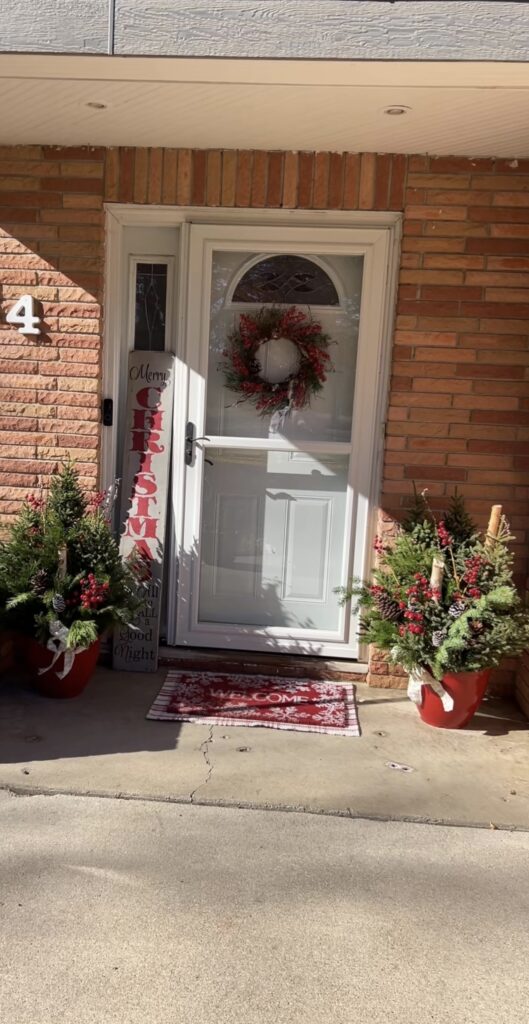 Lastly, I added a bow to the front of my pot to spice it up a little. I then placed these by the front door. I did make two, so I could place one on both sides of the door. This is such a fun way to add some Christmas decorations to the outside of your house, without putting in too much work, like putting up Christmas lights.