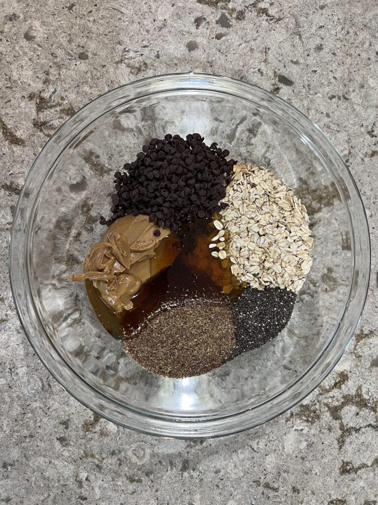 Mix all of the ingredients listed above together. Let the mixture chill in the fridge for about 30 minutes to make it easier to roll the mixture into balls. After being chilled, scoop out your desired amount of mixture and form into balls. Place these onto a cookie sheet lined with parchment paper for easy clean up. Chill in the fridge before eating. Enjoy!