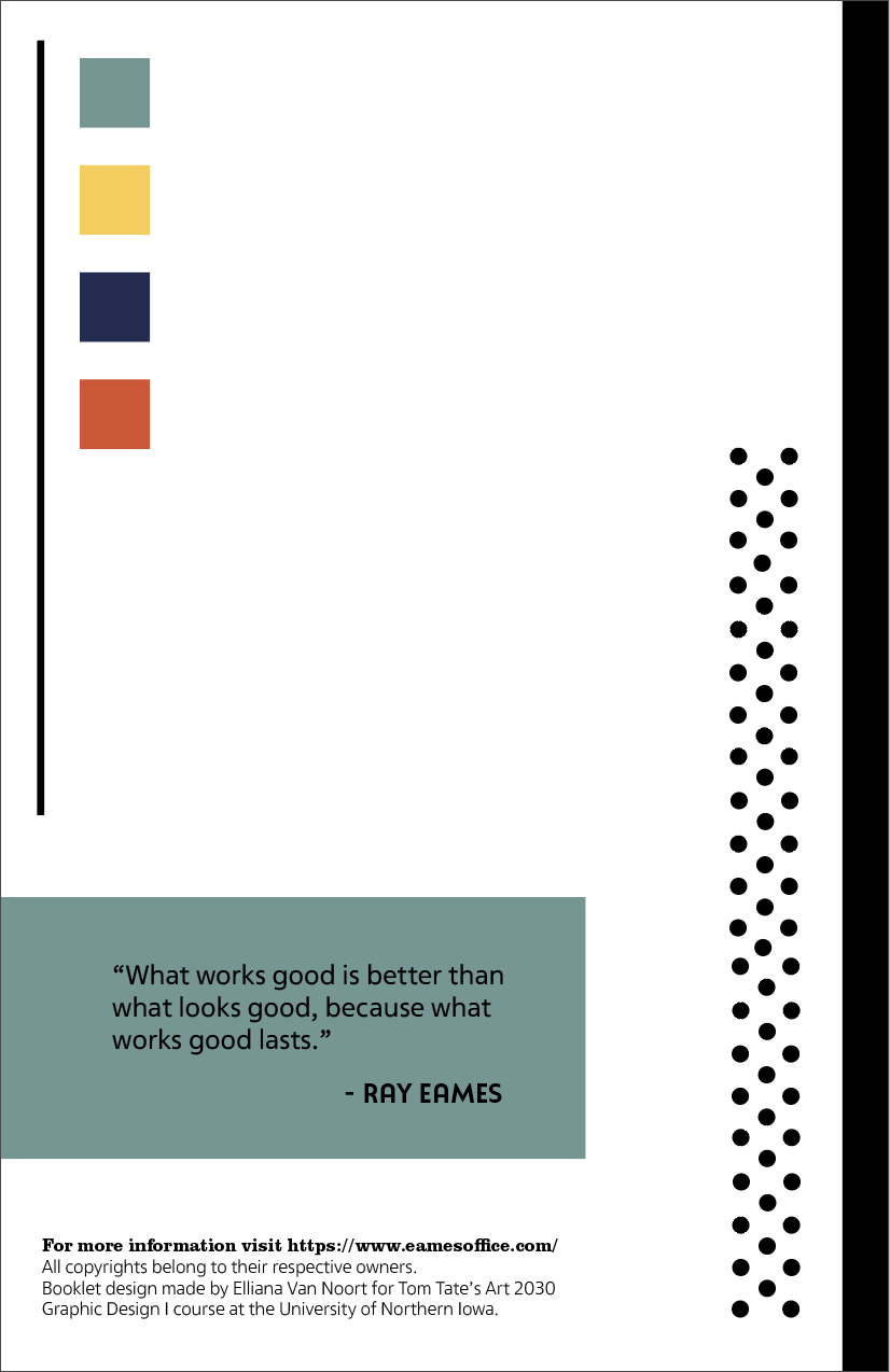 This booklet was made for my Graphic Design I course, Spring 2025. The project was to create a booklet about an industrial designer or architect to learn more about the history of design and to practice visual hierarchy and empower typographic messages.